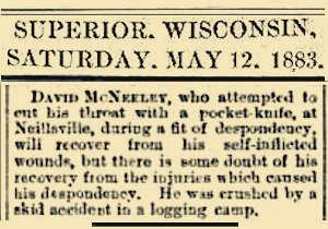 David McNeeley, who attempted to cut his throat with a pocket-knife, at Neillsville, Wisconsin during a fit of despondency, will recover from his self-inflicted wounds, but there is some doubt of his recovery from the injuries which caused his despondency. He was crushed by a skid accident in a logging camp. |