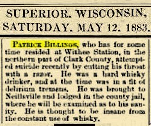 Patrick Billings, who has for some time resided at Withee Station, in the northern part of Clark County, attempted suicide recently by cutting his throat with a razor. He was a hard whisky drinker, and at the time was in a fit of delirium tremens. He was brought to Neillsville and lodged in the county jail, where he will be examined as to his sanity. He is thought to be insane from the constant use of whisky. |