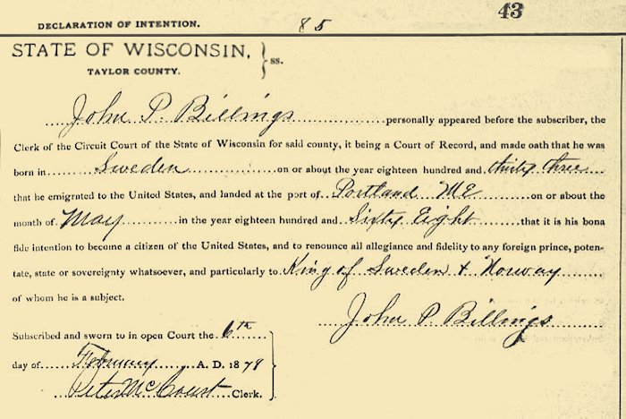 Single White W 1874 Abt 1874 WI John P Billings Johanna Billings Sweden Sweden