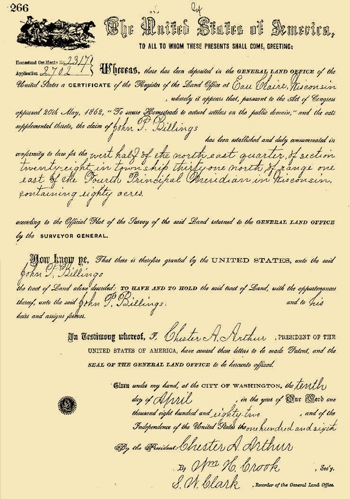*We could not find additional information regarding Patrick Billings. However, James Billings and his family were living nearby in Grant township, Clark county in 1880 and he is buried in the Neillsville, WI City Cemetery.
