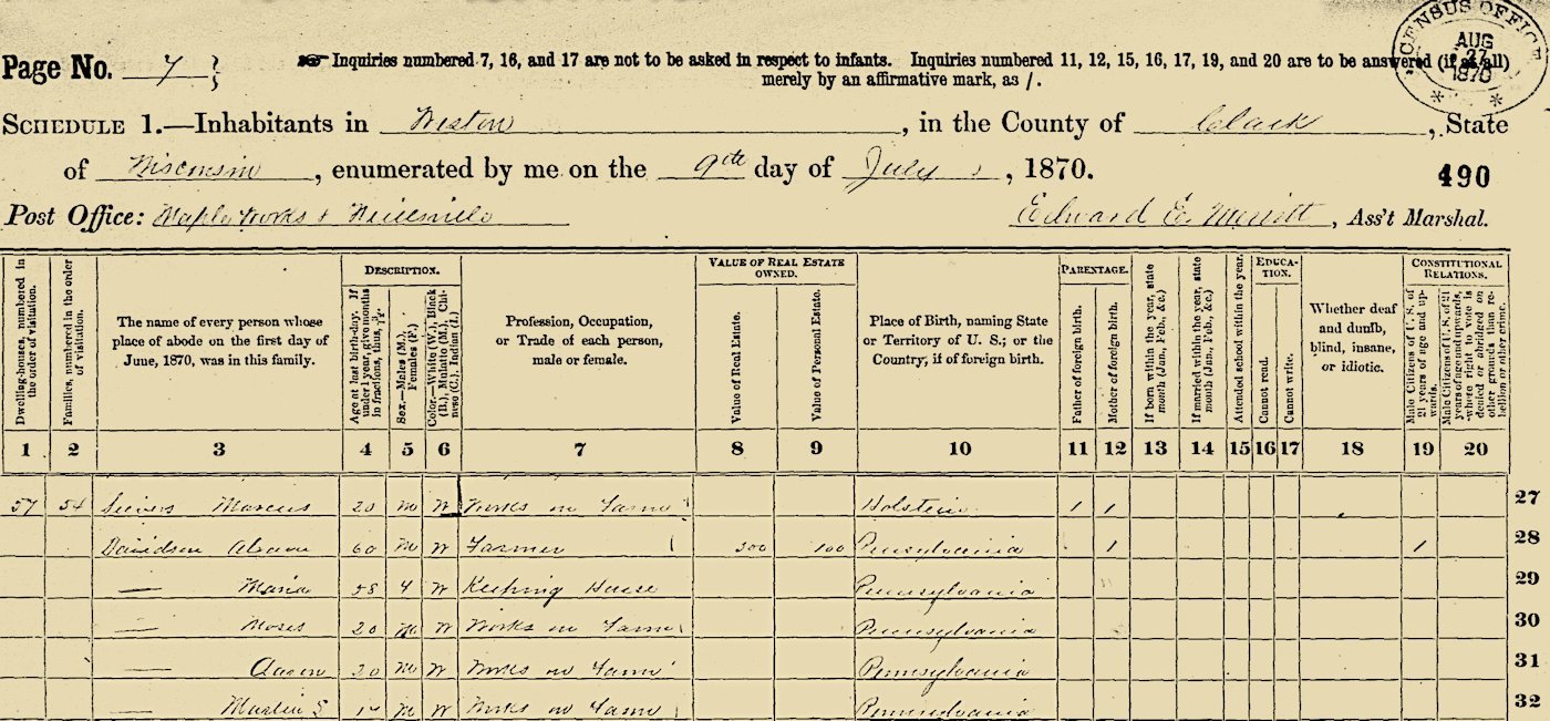 Marcus Sievers 1870 Male 20 White 1849-1850 Holstein