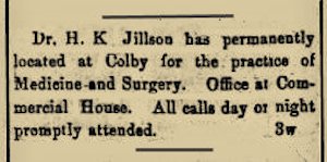 Hiram Keyes “HK” Jillson entered life on this earth, 6 Jun 1850 in Litchfield, Medina County, Ohio, USA. He was one of eight children born to Alfred W Jillson (1824–1894) & Emma Jillson (1828–1881). He married Eugenia Francis Bent. 11 Jun 1871 in Wisconsin. He practiced medicine and surgery in an office in the Commercial House in Colby, Wisconsin after relocating from New London, Wisconsin.
