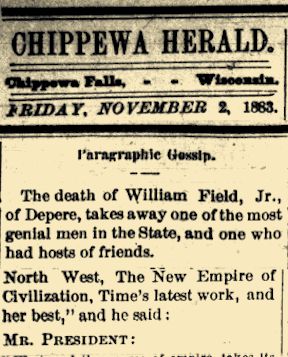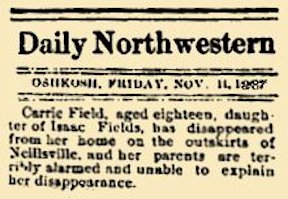 Daily Northwestern ========================== Oshkosh, Friday, Nov.11, 1887 ========================== Carrie Field, aged eighteen, daughter of Isaac Fields has disappeared from her home on the outskirts of Neillsville, and her parents are terribly alarmed and unable to explain her disappearance. |