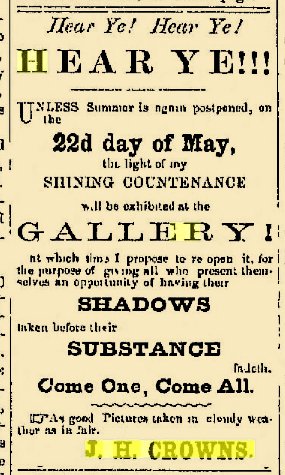 Something New in Neillsville J. H. Crowns has just opened a Photograph Gallery over Wells wagon shop, and he would respectfully announce to the citizens of Neillsville and vicinity that he will be happy to take the shadows of all those who May favor him with a call. Having had long experience in the business and kept posted in all the improvements of the art, he feels confident he can please the most fastidious. Specimens of his work can be seen by calling at his gallery. Pictures copied and enlarged. Colored in oil, India ink, or water color if desired, and satisfaction guaranteed. Good pictures taken in cloudy weather. Best time from 9 a.m. to 3 p.m. A good assortment of Picture frames, Albums, etc on hand.