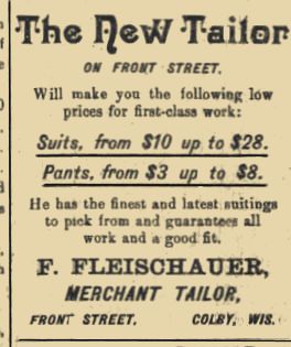 On Oct. 30, 1891, Mr. and Mrs. Fleischauer came to the United States and settled in McKeesport Co. Here they remained until Aug. 6, 1895, when they came to Colby, Wis., Mr. Fleischauer following up his trade of tailoring.