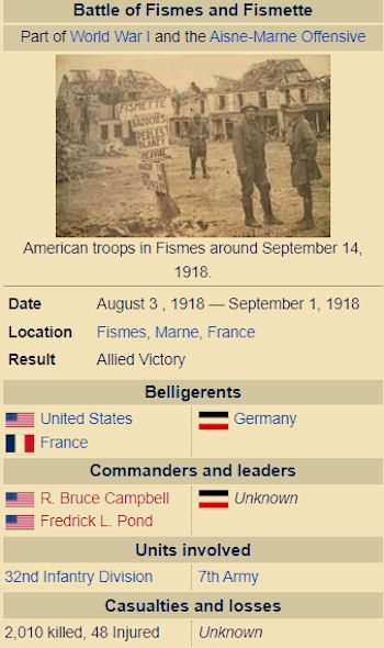 *The Battle of Fismes and Fismette was a battle fought during the First World War that took place from 3 August to 1 September 1918 during the end of the Second Battle of the Ourcq and the Aisne-Marne Offensive. Fismes is a small commune in the Marne department in the Champagne-Ardennes region of northeastern France. It is crossed by the Vesle River and linked to the hamlet of Fismette by a memorial bridge that commemorates the sacrifices made the by soldiers of the 28th Infantry Division ("Keystone") who fought to liberate the region during the First World War.