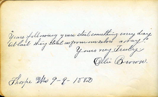 Pictured above is a page from an autograph album which once belonged to my great grandmother, Annie Petrie Olson. Annie's family - Adam Petrie, Elizabeth Moore Petrie and children George Walter, Edith and Annie lived in Unity from 1874 until 1888. The book must have been a Christmas gift in Dec., 1879. I counted 71 pages in the album with inscriptions from friends and relatives (1879 - 1889). Each inscription is hand written, usually with name, date and town. Some of the calligraphy is wonderful. In paging through, I see Unity, Thorpe, Brighton, Chippewa Falls, Concord, Stockbridge, Colby, Eau Claire, Neillsville, Oshkosh, Milwaukee, Withee. Most of the entries are from Unity. I eventually hope to provide scans of every page and this one, dated September 9, 1880 was from Ollie Brown of Thorpe, Wisconsin.