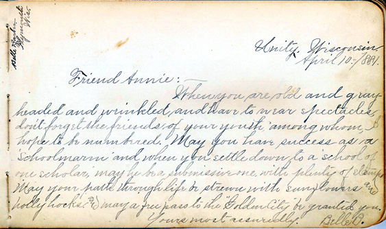 Pictured above is a page from an autograph album which once belonged to my great grandmother, Annie Petrie Olson. Annie's family - Adam Petrie, Elizabeth Moore Petrie and children George Walter, Edith and Annie lived in Unity from 1874 until 1888. The book must have been a Christmas gift in Dec., 1879. I counted 71 pages in the album with inscriptions from friends and relatives (1879 - 1889). Each inscription is hand written, usually with name, date and town. Some of the calligraphy is wonderful. In paging through, I see Unity, Thorpe, Brighton, Chippewa Falls, Concord, Stockbridge, Colby, Eau Claire, Neillsville, Oshkosh, Milwaukee, Withee. Most of the entries are from Unity. I eventually hope to provide scans of every page and this one, dated April 10, 1881, was from Belle Barber, of Unity, WI.