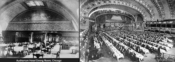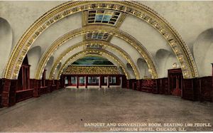 Inside, a palatial lobby opens to the auditorium, where an ornate three-story domed ceiling soars overhead. The walls are decorated with ornamental plaster work, including gold laurels, and a stained-glass window in a Renaissance style glitters behind the stage. A row of carved high-back wooden chairs line the rear wall. Jason Marck/WBEZ
