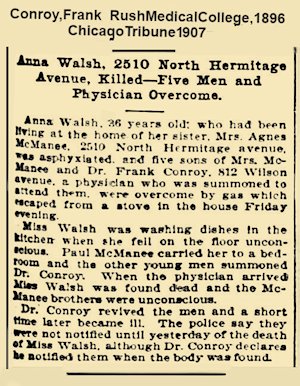 Dr. John Conroy has received news from Ravenswood, Ill., stating that his brother, Dr. Frank Conroy, was asphyxiated While attending a patient, and came near dying. A Ravenswood family was overcome by gas, which was entirely odorless, and Dr. Conroy and two other physicians were: hastily summoned. Dr. Conroy arrived first and not detecting the presence of gas, started the work of resuscitation, not knowing the cause of the victim's condition. While engaged in the work, he too was overcome. The other two physicians were overcome, but serious results were averted by the arrival of help from the neighbors--Neillsville Times (Jan. 31, 1907)