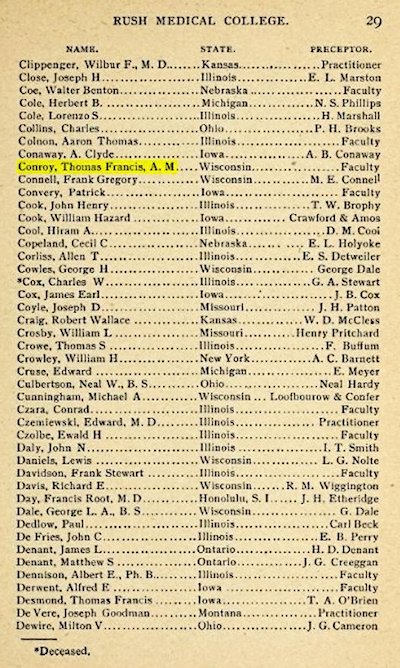 Thomas Frank Conroy Graduated from Rush Medical College-2, Chicago, class of 1896