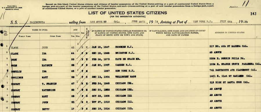 Family Trip departing CA 20 Jun 1932 and arriving NY