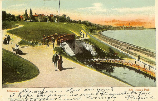 The post card of Juneau Park, was sent from Milwaukee, Wis., at 2 am, 28 Mar 1907 by Regina to Miss Josie Schmidt, Humbird, Wis.