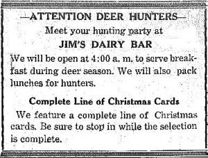 ![]() 16 Nov 1950 Local hunters and fishermen could have lunches packed at Jim's where they could also share their stories with others who enjoyed the same sports and purchase equipment or insecticide approved by the U. S. Army and Geological research. |
