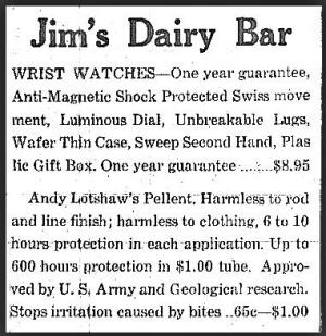![]() 9 Mar 1950 If you needed meds for your stock, hogs, poultry or flock--insecticide paint or udder ointment for your cows-- you could buy it at Jim's Dairy Bar while hearing the local news and treating yourself to an ice cream cone before heading out the door. |