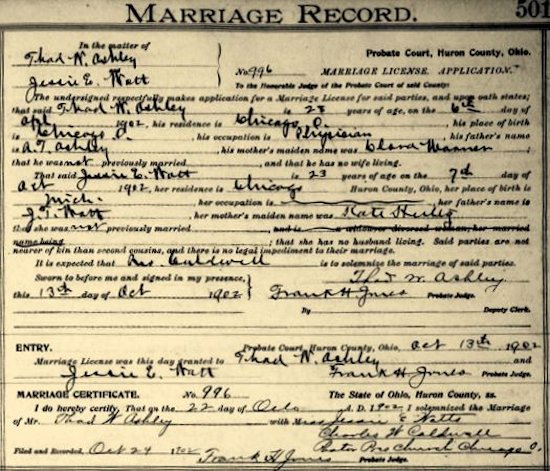 Groom: Thad W. Ashley, 28 yr. old (1874) male