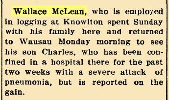 Tuesday, August 13, 1940. Wisconsin Rapids Daily Tribune Wallace W. McLean, 76, a lifelong resident of the community, died at his home in Nekoosa at 1:15 a. m. today following a lingering illness. The Rev. A. W. Triggs of Wisconsin Rapids will conduct funeral services at the Nekoosa Congregational church on Friday, August 16; at 2 p. m. Interment will follow in Riverside cemetery. Friends may call at the Voss funeral home from Wednesday afternoon until 10:30 a. m. Friday, when .the body will be taken to the church to lie in state until time for the funeral. Mr. McLean was born in the town of Armenia, Juneau County, on December 9, 1863. Five children, Charles, Jay, Richard and Theodore McLean and Mrs. Lloyd Felice, all of Nekoosa, survive. His wife preceded him in death in December, 1939. He also leaves one brother, Thomas of Nekoosa, and two sisters, Mrs. Delia Lewis of Washington and Mrs. Martha Sinclair of Strongs Prairie.