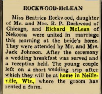 Miss Beatrice Rockwood, daughter of Mr. and Mrs. R. P. Rockwood of Chicago, and Richard McLean of Chicago, and Richard McLean of Nekoosa were united in marriage this morning at the bride's home. They were attended by Mr. and Mrs. Jack Johnson. After the ceremony a wedding breakfast was served and a reception held. The young couple left on a short wedding trip after which they will be at home in Neillsville, Wis., where the groom has rented a farm.
