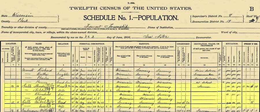 1900 Federal Census, Fremont, Clark, Wisconsin, 2 Jun, Sheet #1, Number of Dwelling in Order of Visitation: 15, Family Number: 15