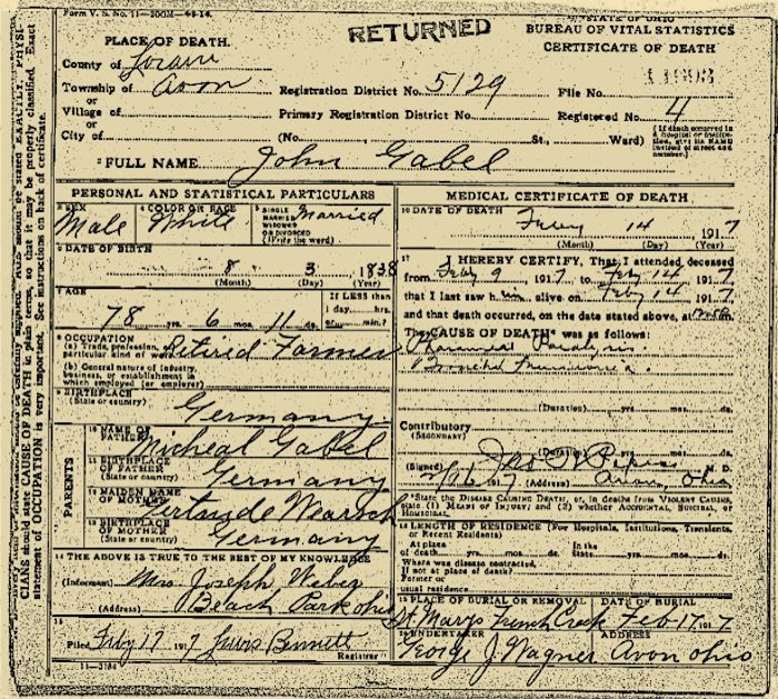 Name: John Gabel, 78 yr. old white married male b. 03 Aug 1838, Germany