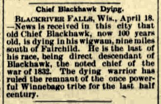 ![]() Chief Blackhawk--Prominent figure years ago. One of the best known and respected characters of the logging days before turn of century in Black River Falls area was Chief Blackhawk, who died about 20 years ago at the age of 80. The Winnebago chief spent the declining years of his life at the Black River Falls Indian Mission. |