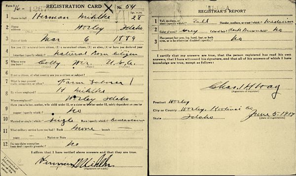 Herman Mihlke was born 6 May 1890 in Colby, Clark County, Wisconsin. He was the son of Herman (1858-1937) and Wilhelmine Hooverjack Mihlke (1858-1933). His wife was Mable Smith Mihlke (1 Jan 1890, Oregon-28 Dec 1955 @ aged 65) . Herman died when he was seventy-four, he died in Plummer, Benewah County, Idaho,12 Oct 1964 and was buried in the Marshall Cemetery, Spokane, Spokane County, Washington.