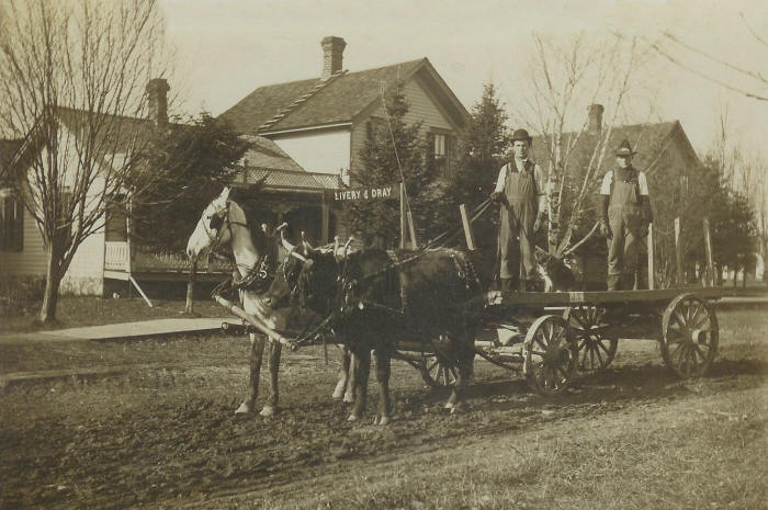 Summary Of Lot 3 Block 2: During the six months that Benson Davis owned Lot 3, he constructed a fairly large two-story barn on the West 50 feet of the lot. The barn was built in the summer of 1878 and functioned as a multi-purpose building. The lower level was used as a workshop and horse barn while the upper level was used for storage and perhaps even a dance or two. In 1895 the Wieden Family who owned the property at that time hung out a shingle which said “Livery Stable and Dray”. So the barn became officially a place where people could come and rent horses and carriages which would take them to their place of destination. The barn was used as a livery stable for about 25 years. The property was owned by the writer’s father from 1941 to 1947 when he sold it to Henry and Alta Erlei. Henry Erlei a long-term machinist and inventor transformed the barn into a blacksmith shop and it was never the same again. Alta Erlei will be highlighted in separate and future writings as this very talented woman contributed much to humanity while asking nothing in return. The barn was razed during the 1960s as it became dilapidated and was a haven for all kinds of animals and birds. Today on Lot 3 sits a large attached garage which is capable of containing four automobiles and is undoubtedly the largest residential garage in town. Today the property is owned by the Schauer Family along with Lot 2.The property has exchanged hands 17 times beginning in 1875 and extending to the present day (2006).