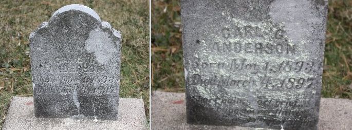 Charles "Carl" G. Anderson (1 May 1893 - 4 Mar 1897), the son of Charles Franklin and Lucy Jane (Brown) Anderson. When he died at the age of four years, he was buried in the Brighton Cemetery, Unity Twp., Sec. 7, Brighton Township, Marathon Co., Wisconsin. His tombstone is pictured below. Later, a brother and his parents were also buried there.