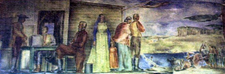 The Mural below the postmaster’s door at the Neillsville Post Office was painted in 1940 by artist John Van Koert and is titled ‘The Choosing of the County Seat.’