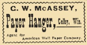 Below is an advertisement featured in the Colby Phonograph 11 May 1905 featuring C. W. McAssey, Wall Paper Hanger of Colby, Clark Co., Wisconsin. Mr. McAssey was an agent for the "American Wall Paper Company."
