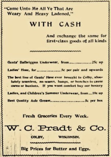 The advertisement below appeared in the Colby Phonograph 23 July 1896. This store was operated by Walter Charles Pradt of Colby, Clark Co., Wisconsin.
