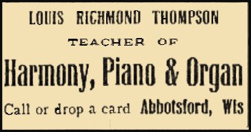 The advertisement below appeared in the Colby Phonograph 6 June 1905, featuring the Harmony, Piano & Organ lessons offered by Louis Richmond Thompson of Abbotsford, Clark Co., Wisconsin.