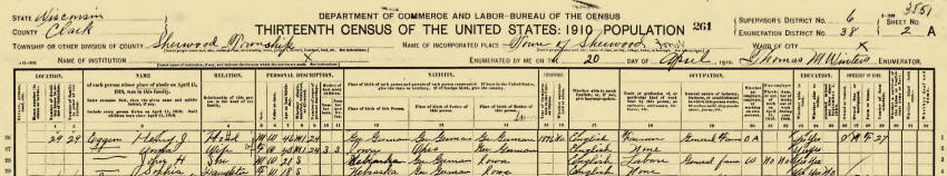 1910 Clark County, Wis. Census for the John Henry Eggen Family