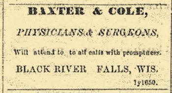*J. W. COLE & CO., druggists and manufacturers, Black River Falls, Wisconsin. The firm was established in 1865, consisting of J. W. and Dr. H. B. Cole, and Dr. J. B. G. Baxter. Opened their first store on the corner of Main and Mason streets, and moved to the building they now occupy, Aug. 15, 1875, and have continued to increase their stock ever since, and now carry from $18,000 to $20,000 stock. In January, 1867, Drs. Cole and Baxter sold out to F. W. Cole, and the firm still remains J. W. Cole & Co. J. W. and F. W. are both natives of New York. J. W. was born Oct. 15, 1843, and F. W. was born Aug. 8, 1846, and was married to Miss Ella Bowman, Sept. 23. 1877, who was born in Wisconsin, Feb. 16, 1856. They are also proprietors of a large gents' furnishing house, at Neillsville, Wis. Both are members of the A. F. & A. M., Black River Lodge, No. 74, Chapter, No. 41, and also La Crosse, Wisconsin Commandery.