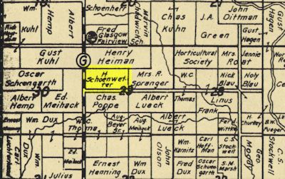 Herbert came to Longwood, Clark Co., Wisconsin with his parents, Frank and Bertha Salzsieder Schoenwetter. They settled on a farm near Longwood where he lived until 1915. In his twenty-second year, he was married to Miss Jennie Spranger and moved to Janesville, where they remained for two years before returning to Clark County and purchased their farm in the Town of Weston, where he lived until his death.
