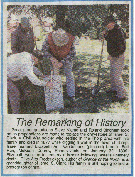 Great-great-grandsons Steve Klante and Roland Bingham look on as preparations are made to replace the gravestone of Israel S. Clark, a Civil War soldier who settled in the Thorp area with his family and died in 1877 while digging a well in the Town of Thorp. Israel married Elizabeth Ann Vandemark, (Pictured) born in Bell Run, McKean County, Pennsylvania on January 30, 1839. Elizabeth went on to remarry a Moore following Israel’s untimely death. Olive Alta Frederickson, author of Silence of the North, is a granddaughter of Israel S. Clark. His family is still hoping to find a photograph of him.