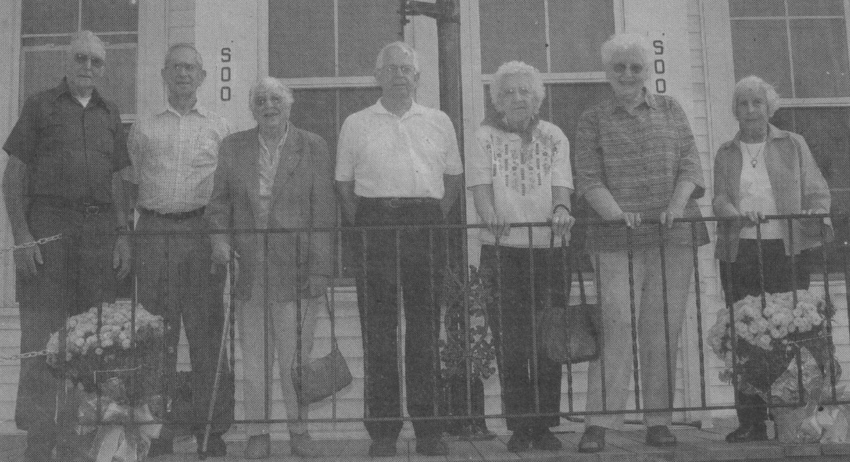 Class members attending were pictured below (from left) Dennis Larson, Edward Brown, Muriel (Prior) Ewert, Verland Drake, Lucille (Fohrman) Miller, Ada (Capelle) Campbell and Harriet (Weyhmiller) Krier.