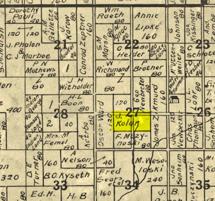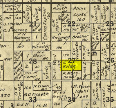 The family of Joseph Kolar lived in Section 27, Levis Twp., Clark County, Wisconsin as shown in the 1915 map above.