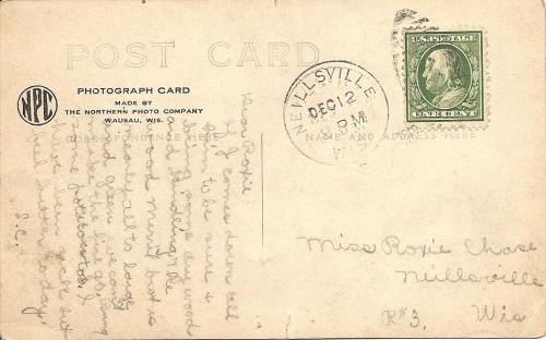 The post card above was sent from Neillsville, Wis. to Rt. 3 Neillsville, Wisconsin. So both the author and the receiver were area residents.