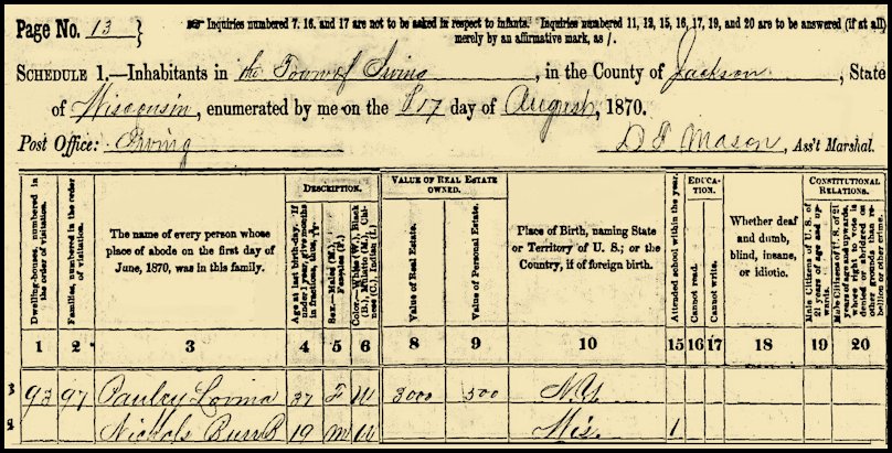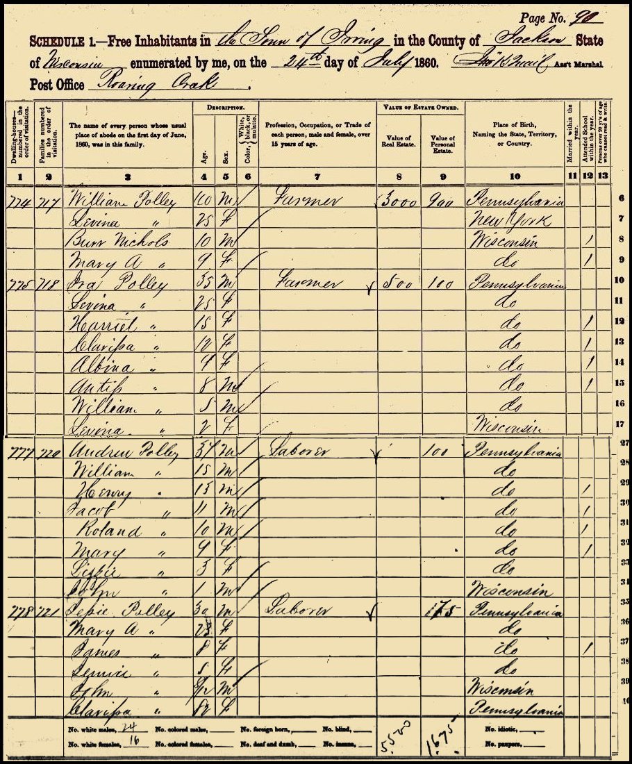 1860 Census, Irving, Jackson Co., WI Census with the family of William & Lovina Polley