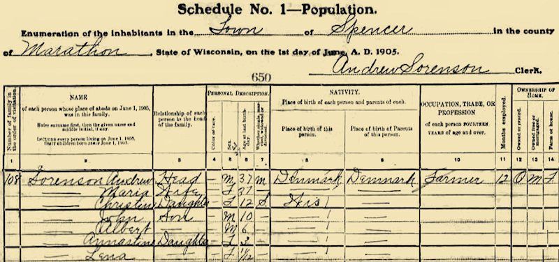 Children: Hanna Christina Sorenson 16 May 1893, Unity, WI–5 Sep 1945, Marshfield, WI; John Emil Sorenson 15 Aug 1895, Spencer, WI–1953; Albert L Sorenson 3 Sep 1898, Spencer, WI–3 Feb 1946, Evanston, IL; Ernestine Sorenson 31 Jul 1901, Spencer, WI–17 Mar 2004, Colby, WI; Lena Henrietta Sorenson 12 Jul 1904, Spencer, WI–9 Dec 1988, Spencer, WI; Alice Sophia Sorensen 27 Jan 1908, WI–19 Apr 1921, WI; Arthur Andrew Sorenson 10 Nov 1910, WI–13 Apr 1987, Wood Co., WI.