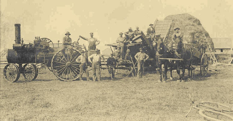 Notice the Steam Tractor used for hauling in the hay and the bicycle in the right foreground, ca 1900.