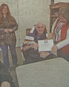 presented a quilt to Louis Landini (middle). The Quilt of Valor mission is to