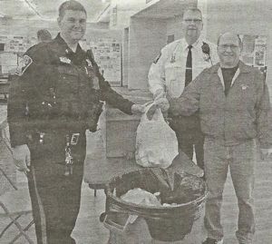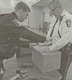 Above (l-r) Patrol Investigator Hunter Imm and Chief Jim Mankowski taped up the first box of medications about 11:30 a.m.