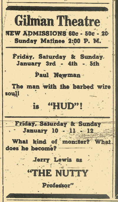A 1964 Thorp Courier Advertisement (Thorp, Wis.) featuring Paul Newman as "Hud" and the Jerry Lewis film, "The Nutty Professor" at the Gilman Theatre, Gilman, Wisconsin.