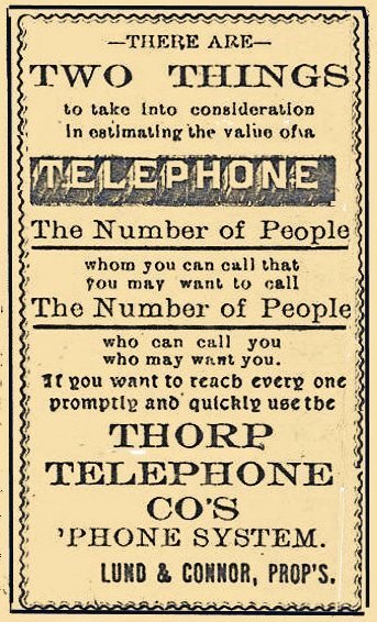 The telephone business in Thorp originated with James Connor, who ran a saloon, where the bank building was built, later, as the telephone exchange was in a little wooden building behind it. Connor was also deputy sheriff at that time. Those who knew him said, “He made it go, every job he took on.” The Thorp business was incorporated as the Thorp Telephone Co. in 1905, and was operated by the Myron Lund Family until 1938. At that time it went into the hands of L. O. Bernhagen. At the time Bernhagen took over there were 173 telephones in the exchange. In seven years the number grew to 412, with pressure for installations beyond the capacity to fill them, results from the rapid development at that point in time. Clark County Press