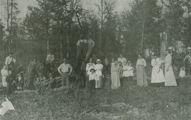 Mrs. Hugo Kuehl reminisced of the days when her family, the Kiles, moved into the logging camp with fourteen buildings still standing. Especially recalled was the huge tree cut for kindling for the school, but it was a solid tree. So the log was taken to the mill in Thorp, but it was tool large to go through the doorway. A blasting expert offered to remove a little from the edges so the choice log could be made into lumber. Instead the "expert" reduced the whole log to kindling.