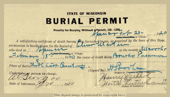 ----Source: St. John Burial Records, Spencer, Wisconsin, Census Record