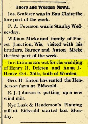 Invitations are out for the wedding of Henry H. Driesen and Anna C. Henke Oct. 25th , both of Worden. Stanley Republican, Oct. 15th