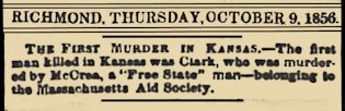 * Note: It is a strange coincidence that the first murder in Kansas occurred that fall when McCrae killed Clark, October 9. 1856.